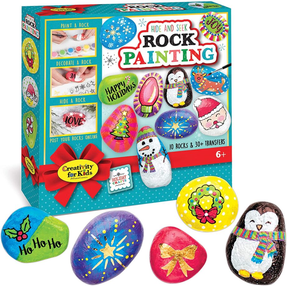 - PAINT AND HIDE YOUR ROCKS – Spread kindness this holiday by hiding painted rocks throughout your community. This intro to rock painting kit is open-ended which allows you to customize your painted rocks so they are unique to you