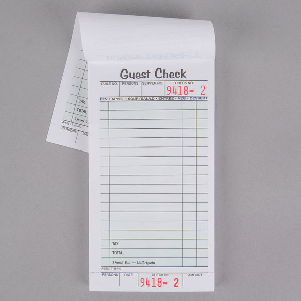 Single part guest checks printed on white tag, Dimensions – Book size: 3-2/5″ x 6-3/4″, Detached size: 3-2/5″ x 6-1/4″