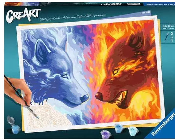 Whether you’re running hot or cold, spend time creating “Fire & Ice” wolves and feel the tension ease with this CreArt Painting by Numbers set!