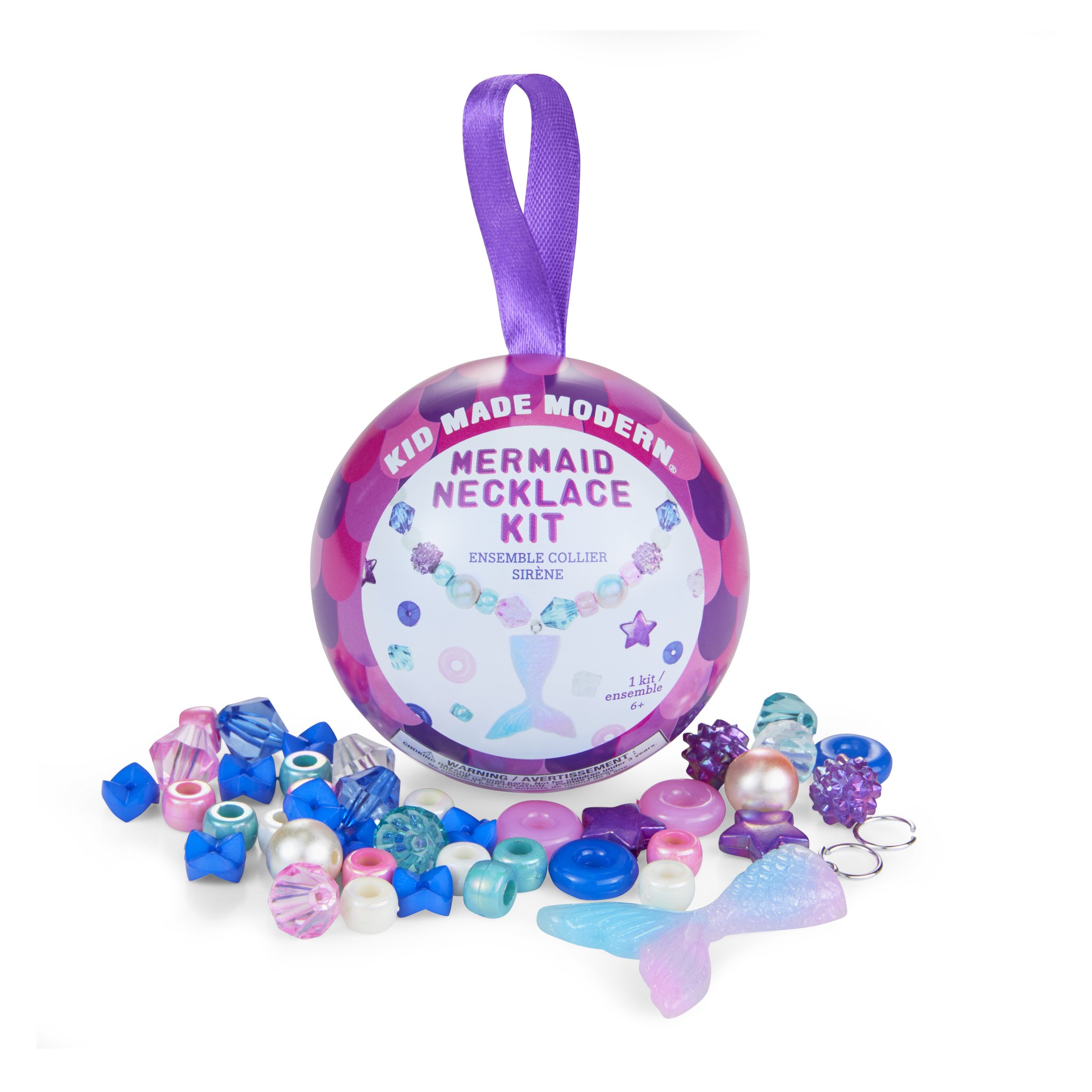 Create mermaid necklaces that are anything but ordinary. Features shimmering beads inspired by shells and mermaid tails. Our mermaid Necklace Kit comes packaged in a tin ball with a ribbon hanger, making it a great gift topper!