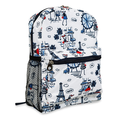 This toddler backpack made of durable polyester includes an external zippered compartment, an external mesh pocket on both sides for a water bottle or otherwise, and a plastic lining that is easy to spot clean. The shoulder straps are adjustable and padded.